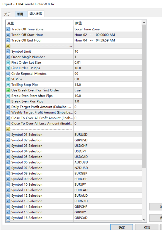 一、适用货币对:主要支持EURUSD(默认)、EURJPY、GBPJPY、USDCAD、USDJPY重点针对欧美、欧日、镑日等流动性高、趋势性较强的货币对优化。
