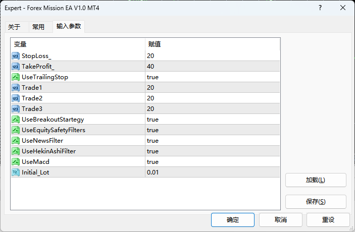 为让交易者快速落地使用,Forex Mission EA给出了清晰的适配参数,降低试错成本:
