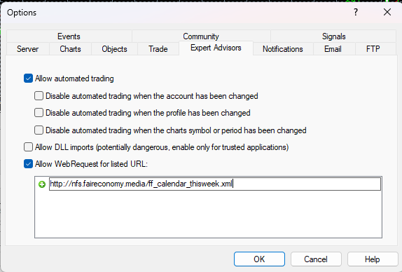设置按以下顺序完成:工具\选项\专家顾问并勾选允许列出的 URL 的 webrequest 并粘贴以下链接: