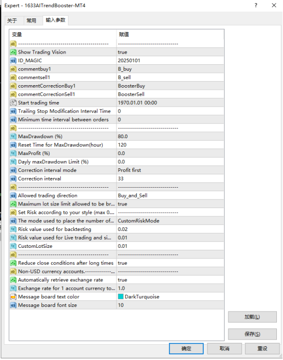 2、适用时间框架:支持任意时间框架,参数主要基于M5(5分钟)和H1(1小时)周期优化,用户可根据风险偏好选择对应周期的配置文件。