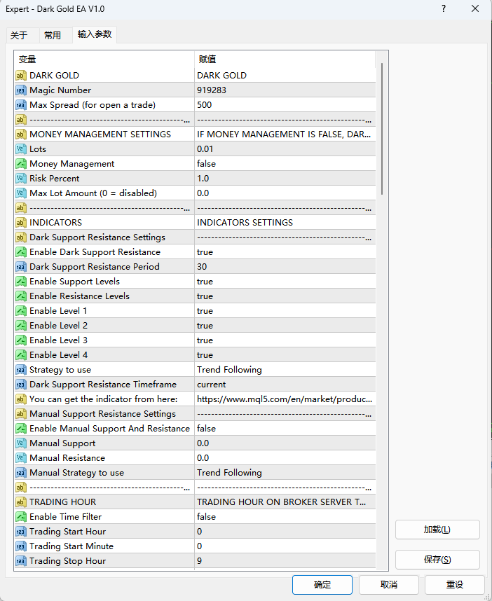 Dark Gold EA的交易逻辑以Dark Support Resistance指标为核心,同时提供灵活策略切换,让交易既依托技术指标支撑,又能贴合市场趋势变化: