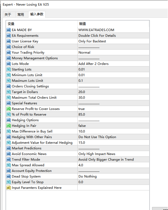 该EA专为主要货币对优化设计,官方回测及推荐的核心货币对包括: